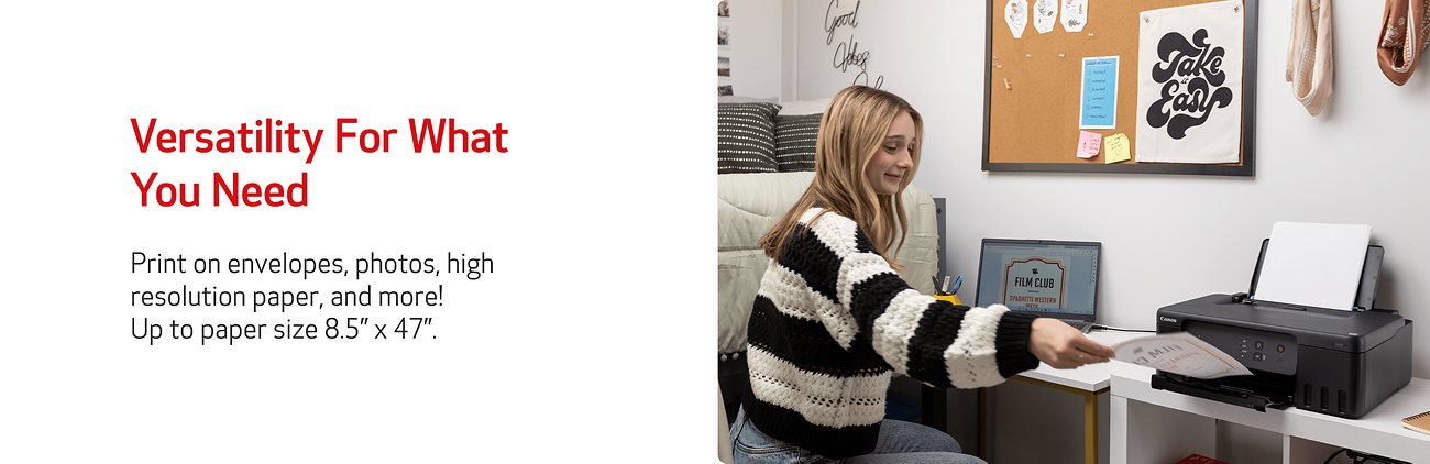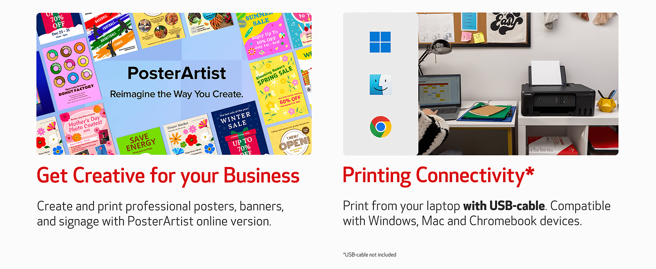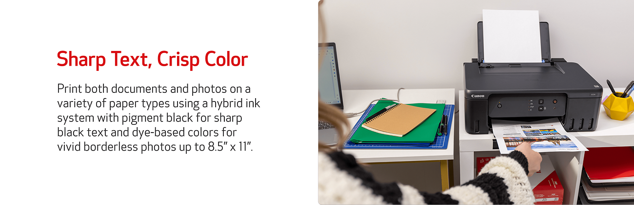 The PIXMA G1230 comes with a full set of ink so you can print with confidence. The PIXMA G1230 is easy to set up and maintain and offers great media versatility to print on a variety of media types and sizes, including photo paper, envelopes, banners and more. Use Poster Artist Online to create professional-posters, banners and signage. Print both documents and photos on a variety of paper types using a hybrid ink system with pigment black for sharp black text and dye-based colors for vivid borderless2 photos up to 8.5” x 11”. Keep printing with a plain paper capacity of up to 100 sheets or 20 photo sheets (4”x6”). Easily connect and print through high-speed USB. This model is compatible with Windows, Mac and Chromebook.