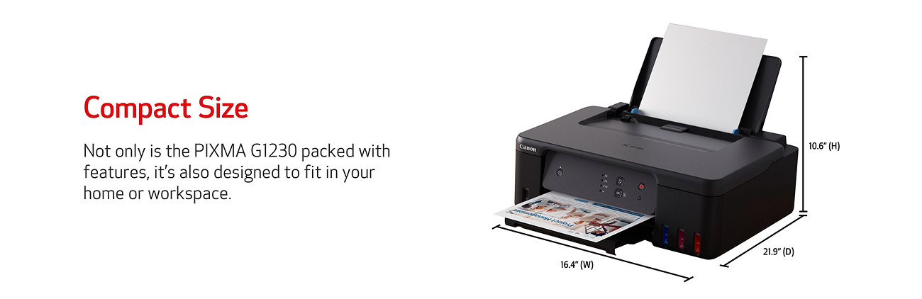 Designed for home and home offices, the Canon PIXMA G1230 MegaTank inkjet printer delivers high-quality, low-cost printing in a compact size. Get serious print productivity with a high page yield of up to 6,000 Black / 7,700 Color pages per full ink bottle1 set and a low cost per print - MegaTank means Mega Savings.