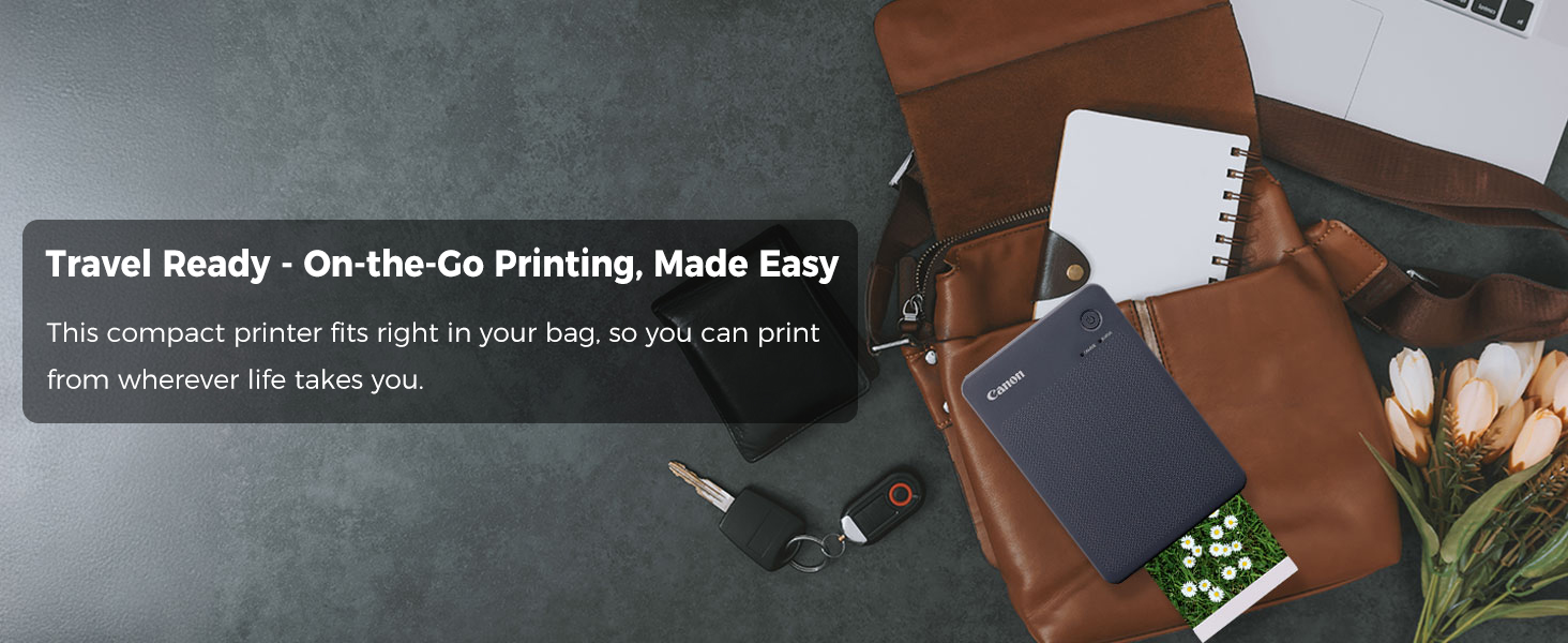 - Compact and portable photo printer with built-in battery and integrated paper tray.